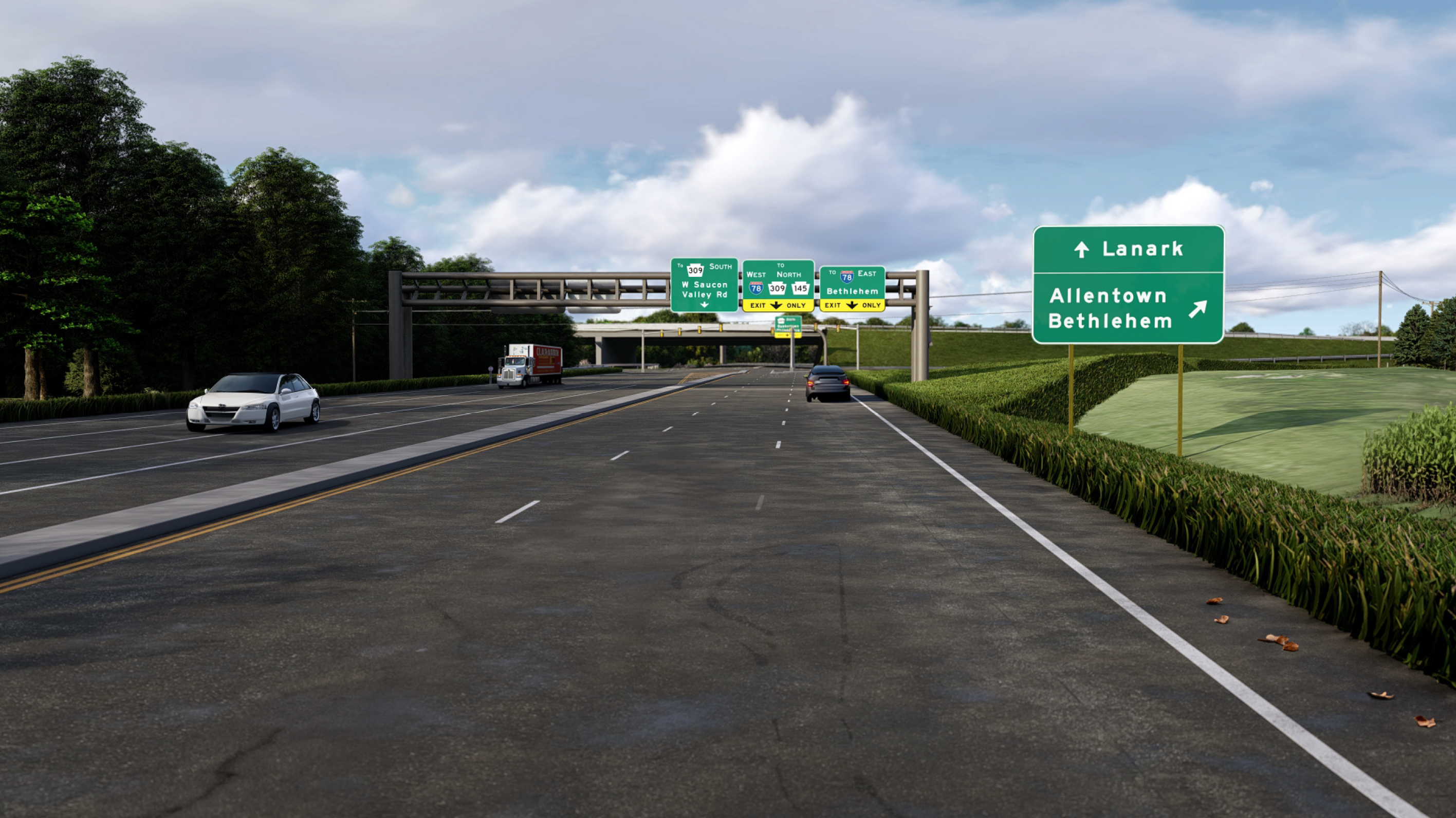 The S.R. 0309, Section 19M Center Valley Interchange Project encompasses a 1-mile corridor of S.R. 0309 in Upper Saucon Township, Lehigh County, Pennsylvania. The project spans from Interstate 78 (I-78) to Huckleberry Drive, focusing primarily on the area 2,900 feet north and 2,200 feet south of the intersection with S.R. 2036 (West Saucon Valley Road) and S.R. 2044 (Center Valley Parkway). The study area extends west along West Saucon Valley Road approximately 1,500 feet to S.R. 2039 (Lanark Road) and east along Center Valley Parkway about 1,200 feet to Corporate Parkway West. The project’s goal is to enhance transportation safety and efficiency by reducing congestion, accommodating planned growth, addressing facility deficiencies, and maintaining regional mobility. Key improvements include grade separation between S.R. 0309 and West Saucon Valley Road/Center Valley Parkway, increasing intersection capacity, and minimizing traffic conflicts due to high volumes. A small folded diamond interchange will be built, along with a new structure to carry S.R. 0309 over West Saucon Valley Road/Center Valley Parkway. The existing S.R. 0309 bridge over Saucon Creek will be raised and extended. Ramps will provide access between S.R. 0309 and West Saucon Valley Road/Center Valley Parkway, which will be widened and include signalized intersections at the ramp connections. Additionally, entrance and exit ramps between eastbound S.R. 0078 and S.R. 0309 will be modified to improve traffic flow between the intersection and interchange. Our PFX Studios developed a complex 3D animation showing existing and proposed conditions, along with simulated traffic conditions.